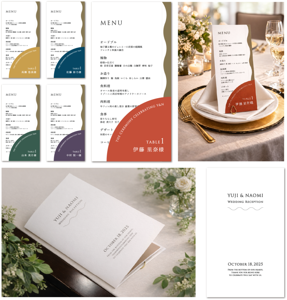名札一体型のメニュー/席次表として、機能性と上品さのバランスを大切に設計しています。